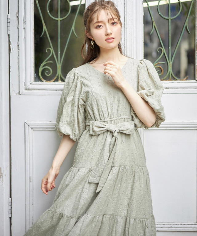 絶妙フェミニンなリボン付きバルーンスリーブコットンレースティアードワンピース Ribbonjourさんコラボ