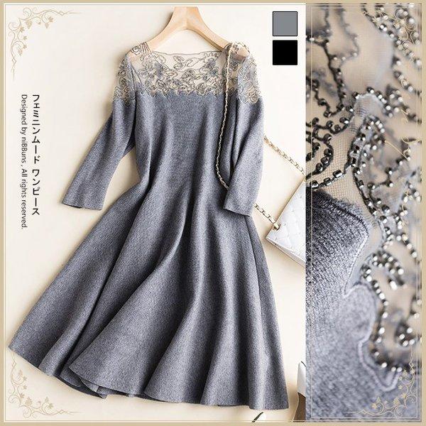 注目ブランド ワンピース 大人ワンピ 上品 ニット フェミニン ビーズ刺繍 素敵なデザイン Elegant Yfashion 新しい到着 Jeannesauve Org